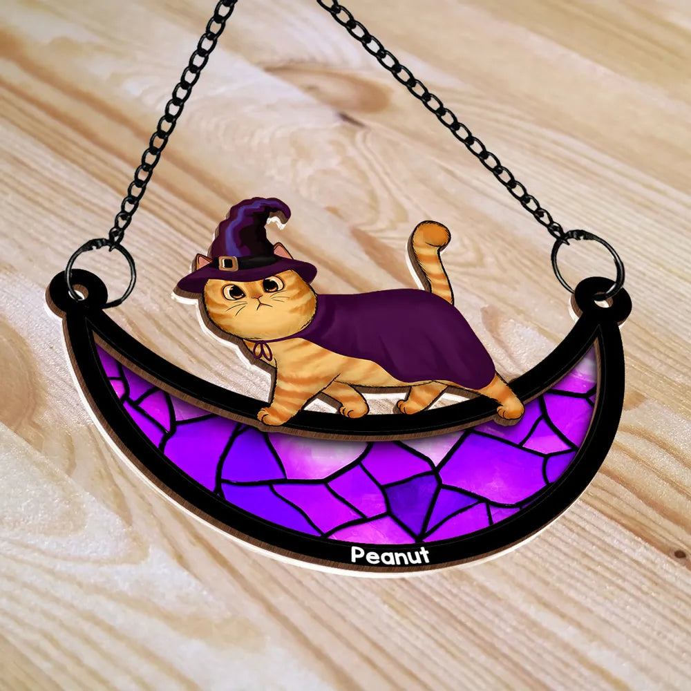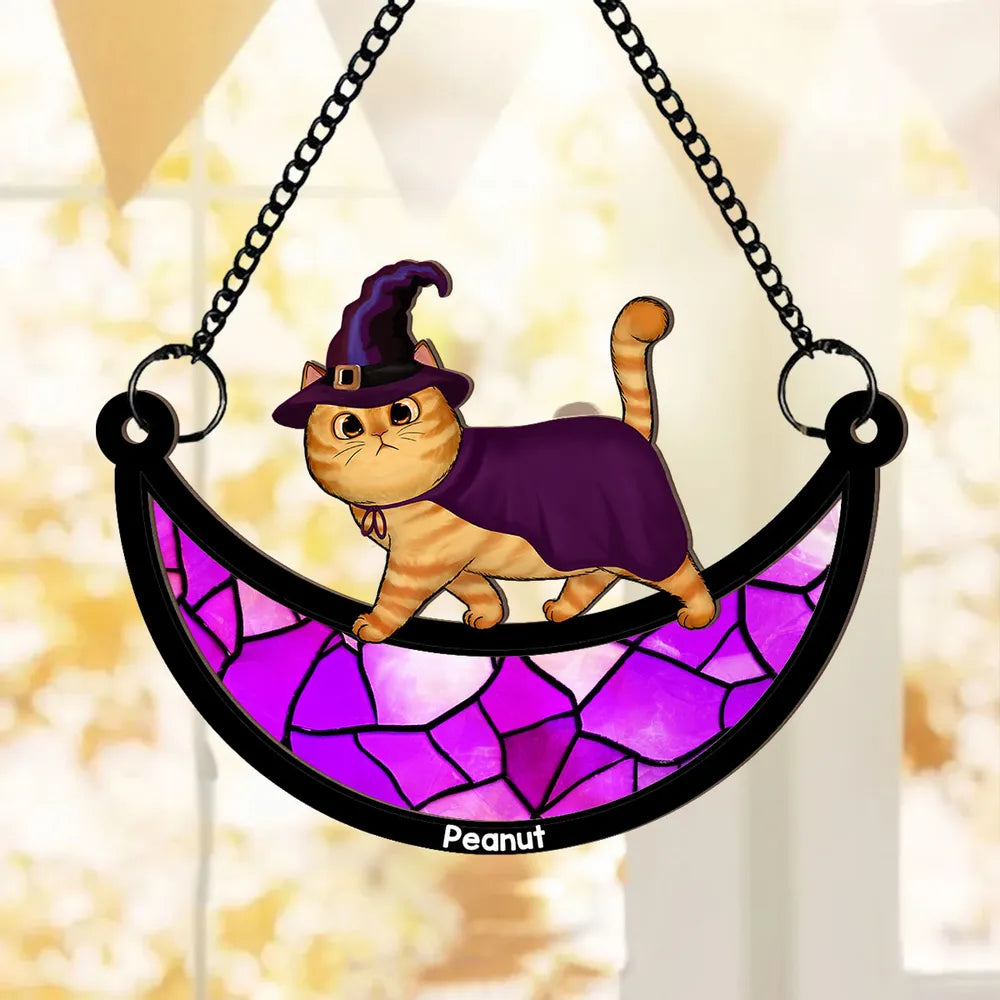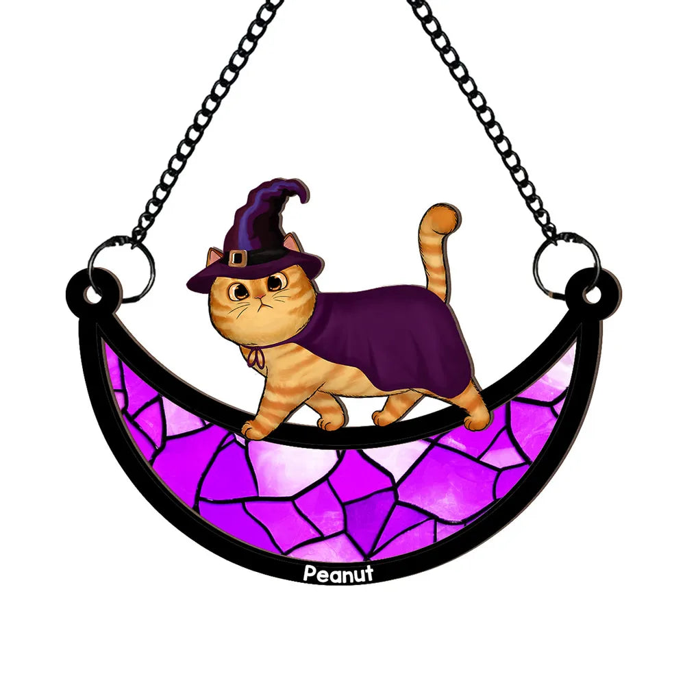 A playful witchy cat stands on a purple crescent, turning your love for felines into a glowing moment of companionship. The layered build and optional pet name make this a personal keepsake—warm, whimsical, and made to shine by the window.